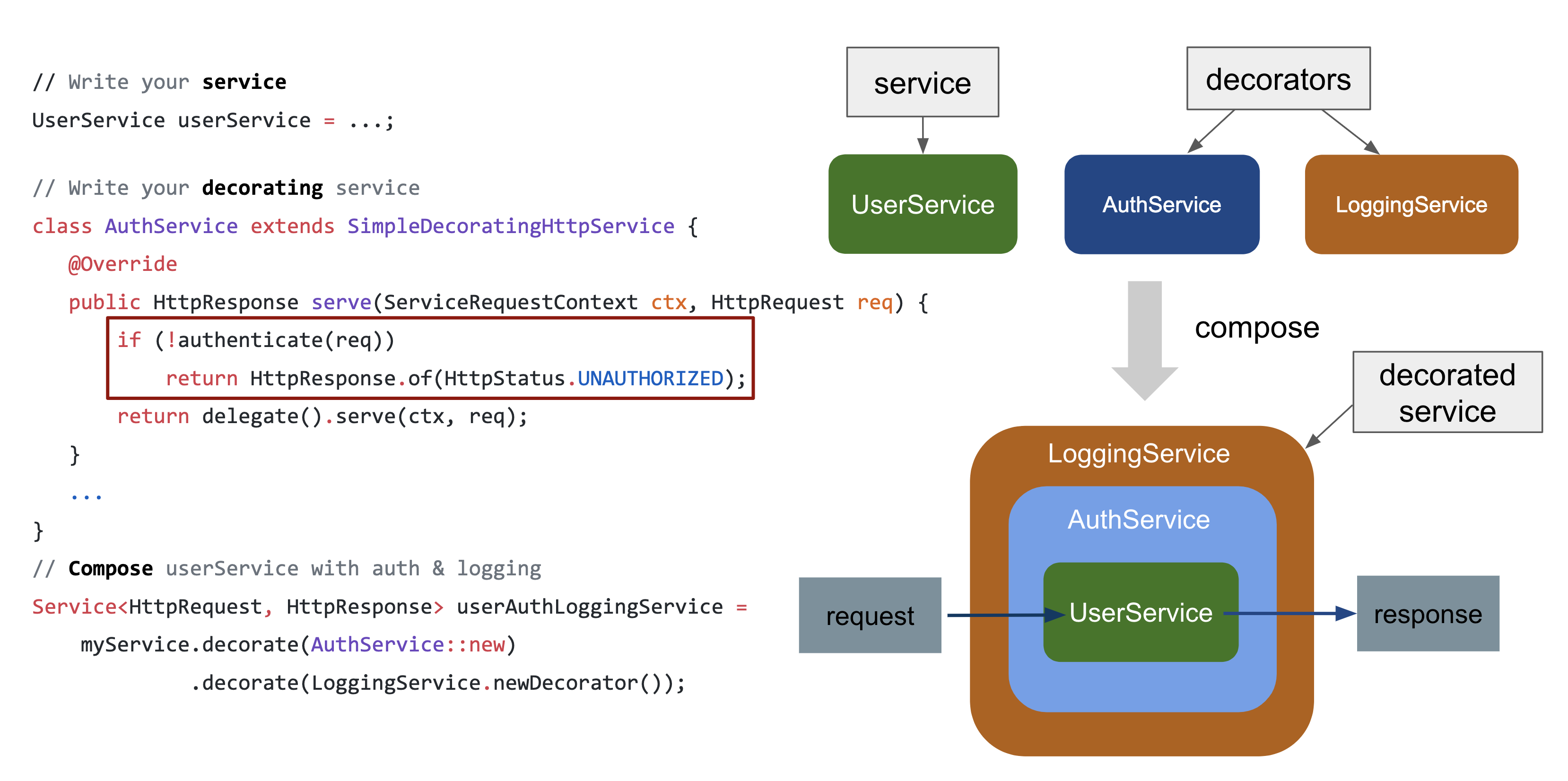Enterprise software developers would all agree that they've spent countless hours coming up with ways to efficiently process authentication and logging. With Armeria, you can put those worries aside. You can use a separate decorator to manage this separation of concerns.[2]