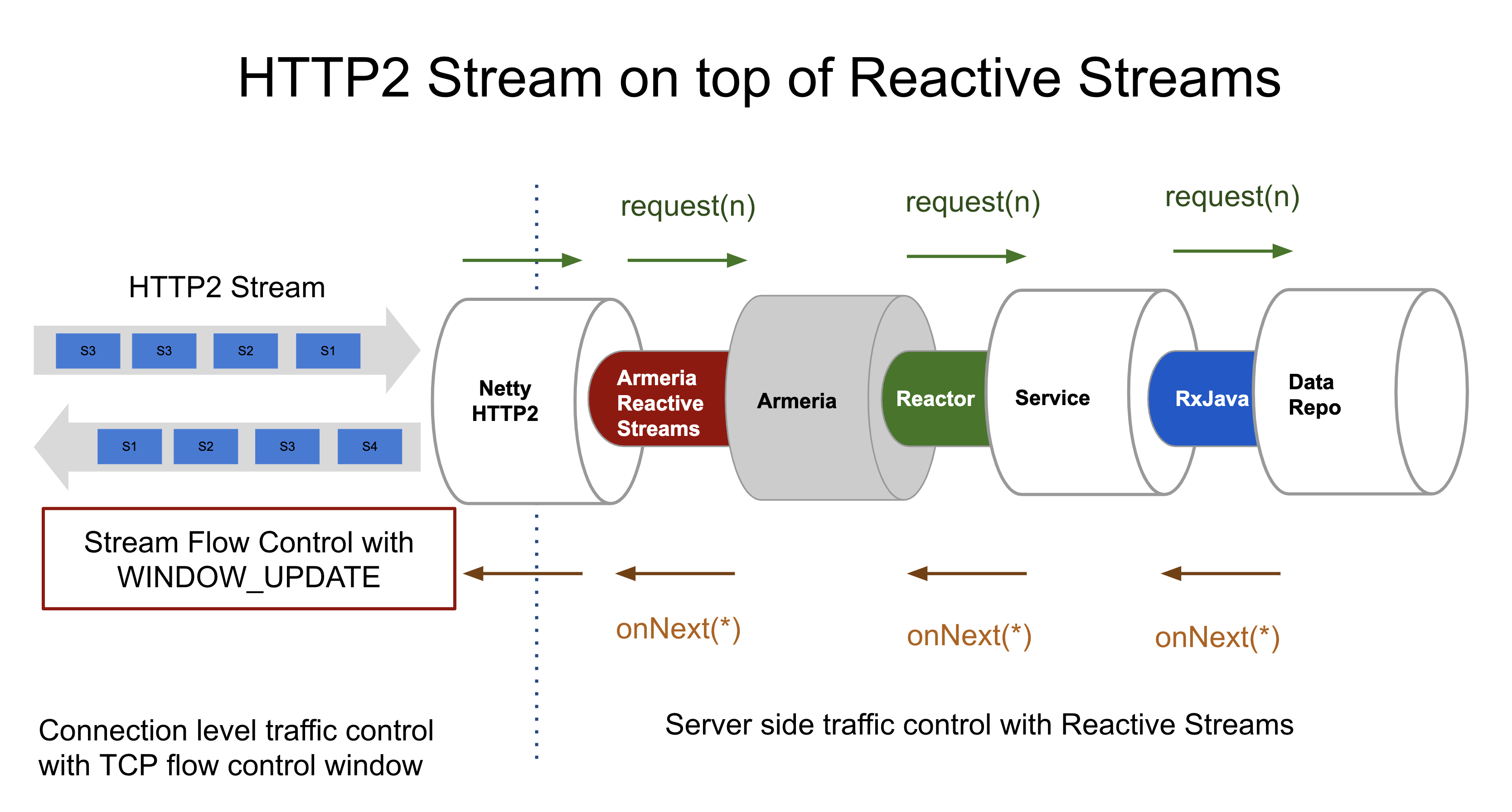 As the name suggests, "streams" need to maintain a connection and let data constantly flow. If there is only one opening while everywhere else is closed, it will lead to an overload. Armeria uses the back pressure feature of Reactive Streams to dynamically control data flow inside servers. Also, back pressure that utilizes HTTP/2 stream flow control using WINDOW_UPDATE allows you to dynamically connect the Armeria server with your services and repositories from subnetwork layers.