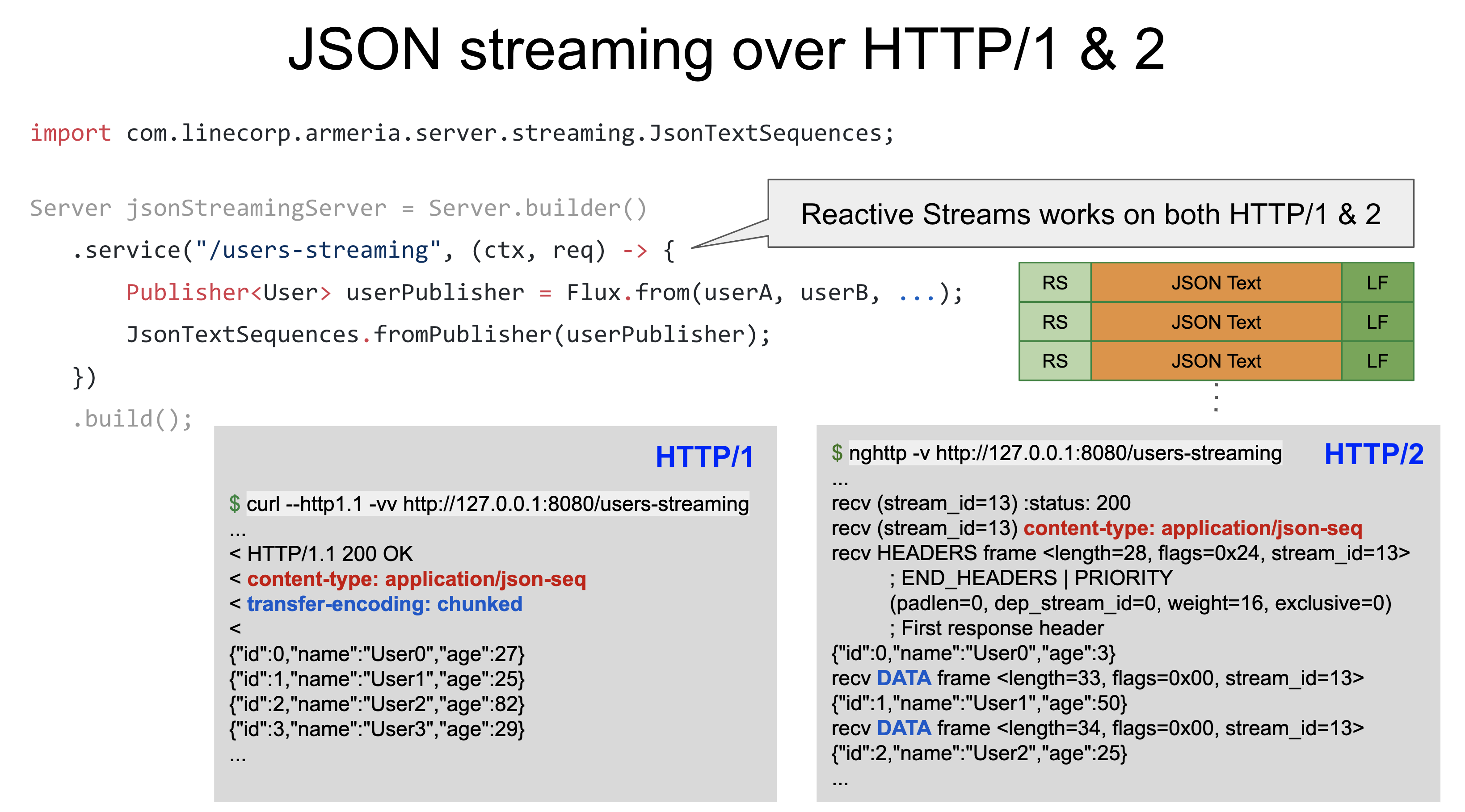 Encoding a JSON text string with 'JsonTextSequences' will add a separator and line feed to the beginning and end respectively. Depending on the protocol, different operations are required when sending data through HTTP/1 or HTTP/2. Armeria automatically finds the appropriate format according to the currently connected protocol. JSON data is divided inside the Data frame for HTTP/2, and chunked transfer encoding is used for HTTP/1.