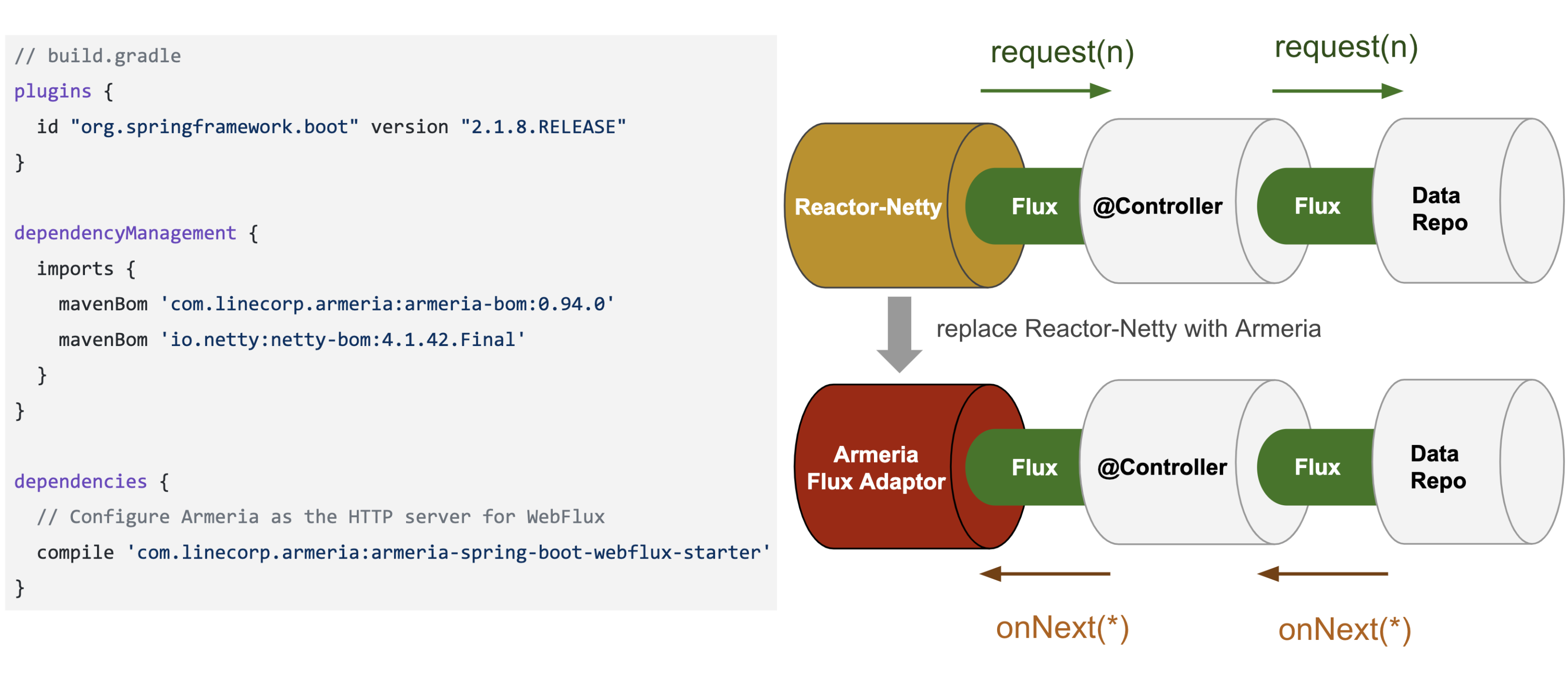 If you are already using Spring WebFlux to use Reactive Streams, you only need to addarmeria-spring-boot-webflux-starterto your dependencies to complete migration to Armeria.