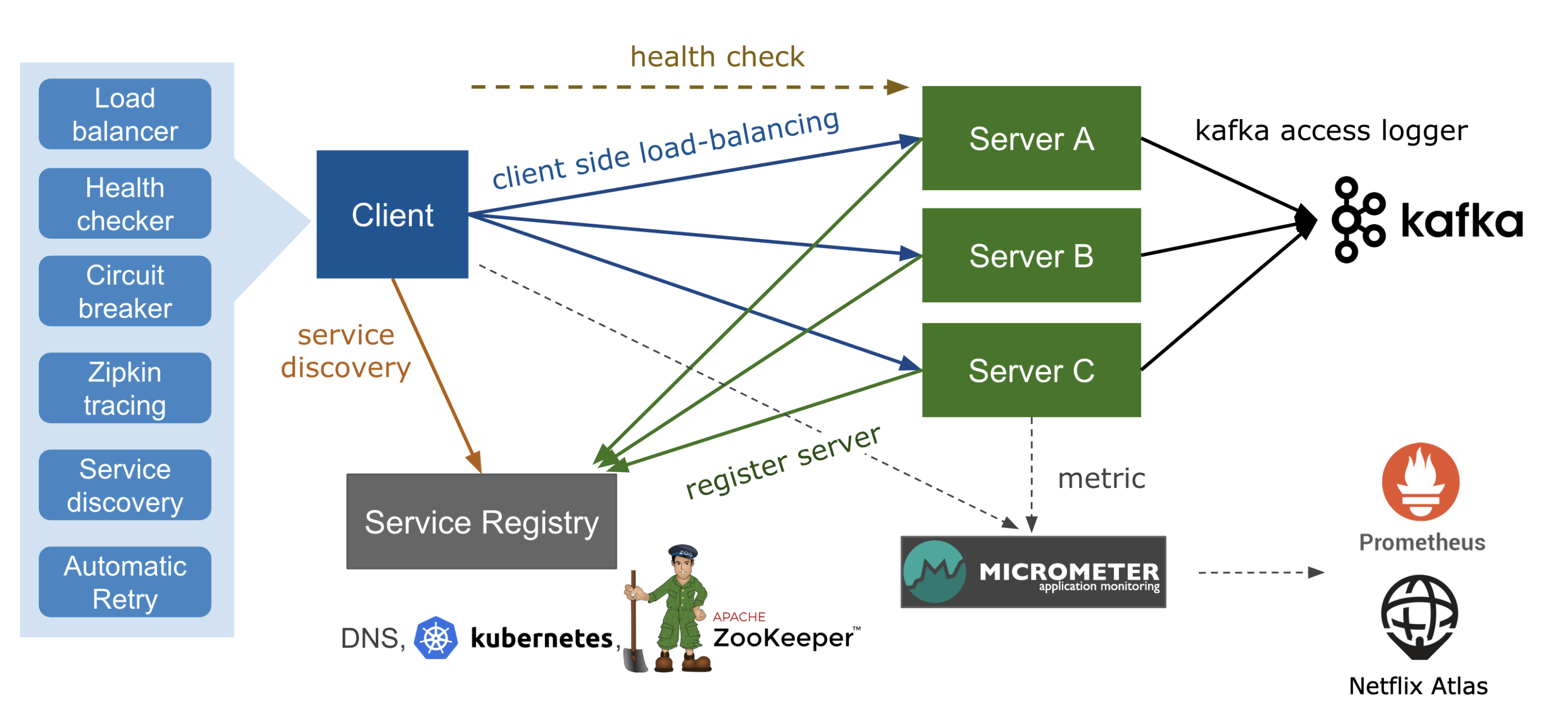 - Kubernetes-type DNS (Domain Name System) and service discovery with ZooKeeper for easily locating servers in a cloud environment.