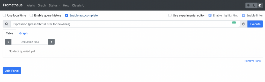 Prometheus uses the 9090 port by default. Navigate to http://localhost:9090 on your browser and you will see the screen shown below.