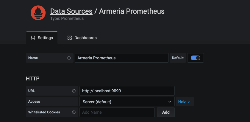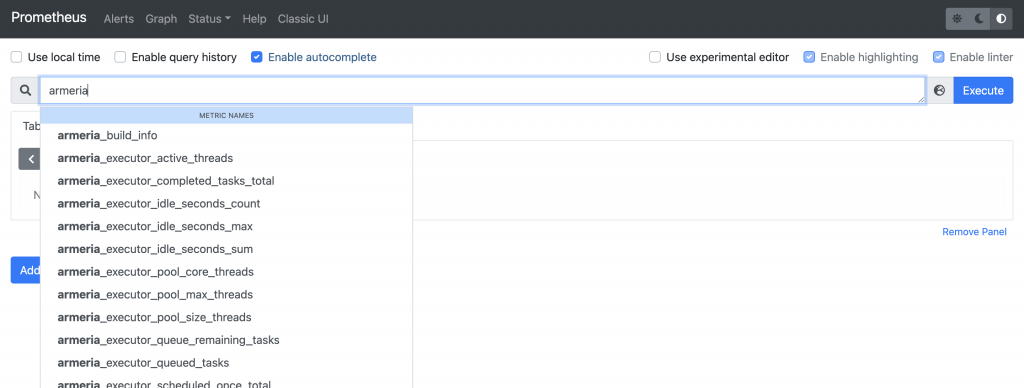 Enter "Armeria" into the search field to check if the related metrics have been properly collected from the Prometheus server.