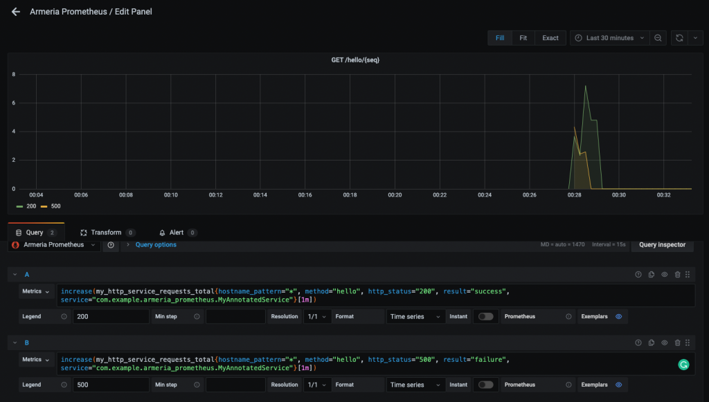 increase(my_http_service_requests_total{hostname_pattern="*", method="hello", http_status="200", result="success", service="com.example.armeria_prometheus.MyAnnotatedService"}[1m]) - 500: