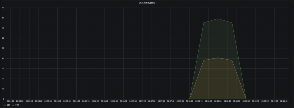 You can see the results of calling the /hello/{seq} API being expressed as a beautiful graph on Grafana.