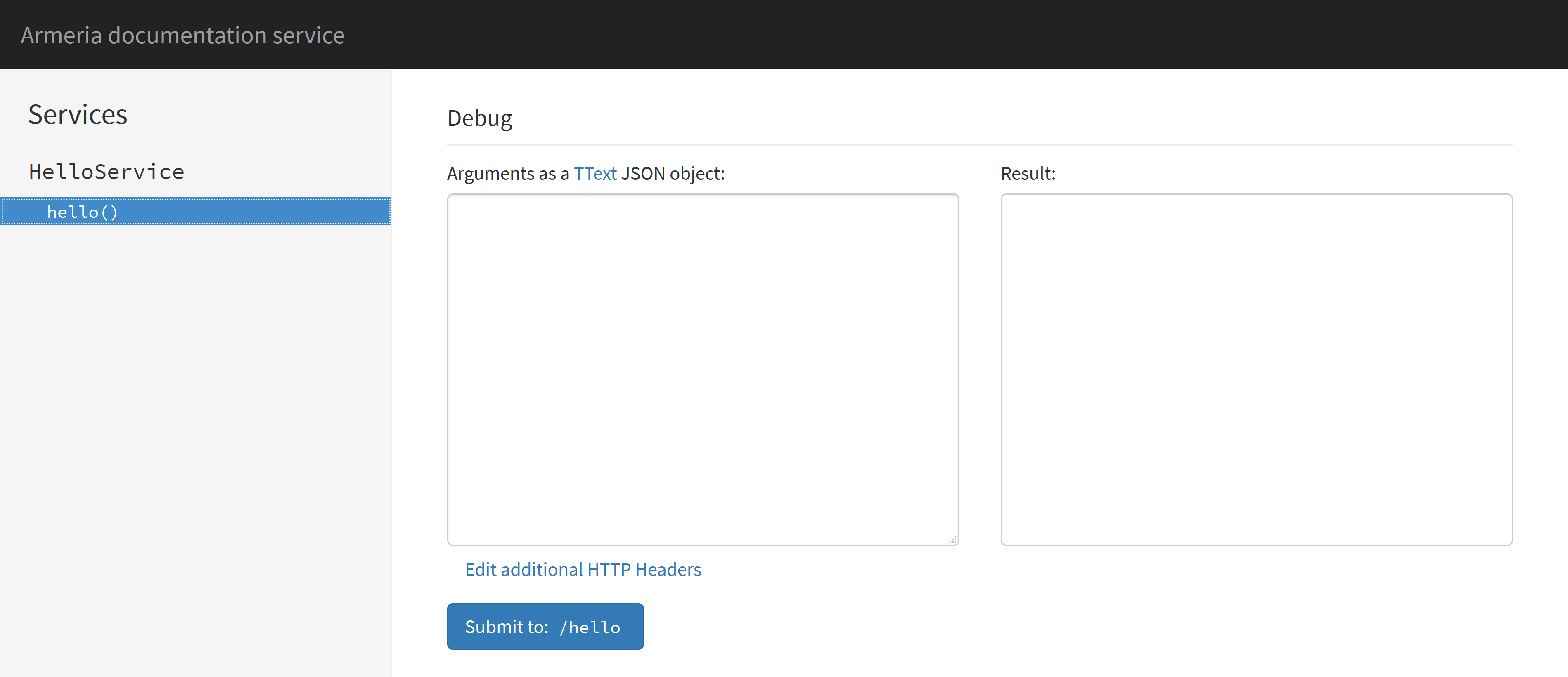 Type the request parameters like the following and click the 'Submit to: /hello' button: