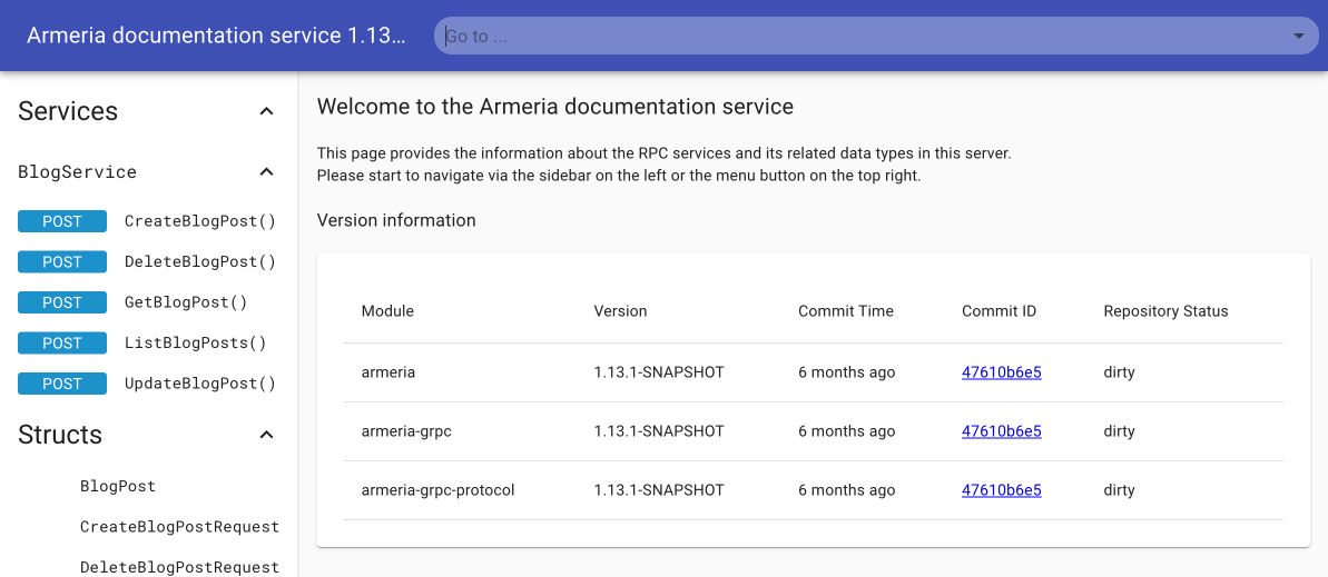 This time, we'll add Armeria's Documentation service. The Documentation service automatically creates documentation of your service methods, as well as providing means to test out the methods.
