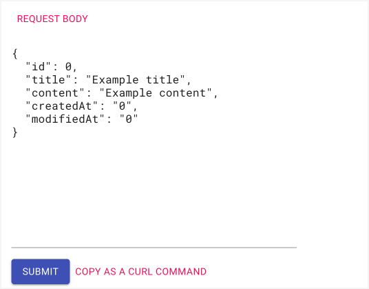 Note that in the REQUEST BODY section the values specified in the exampleRequest are automatically displayed on the page.
