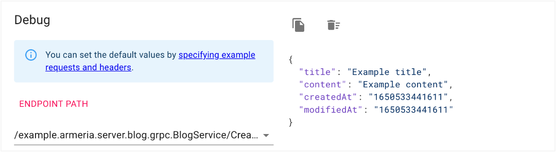 newServer()method, add aDocServiceinstance and a request example for creating blog posts, usingDocServiceBuilder.exampleRequests(). Feel free to add more examples for other service methods.