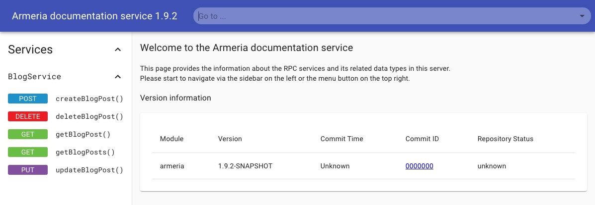 In this step, we'll add an empty blog service to the server we created in Step 1. Create a server. Also, we'll add Armeria's Documentation service for testing our blog service.